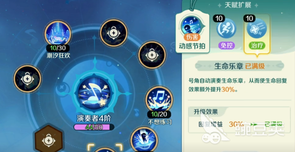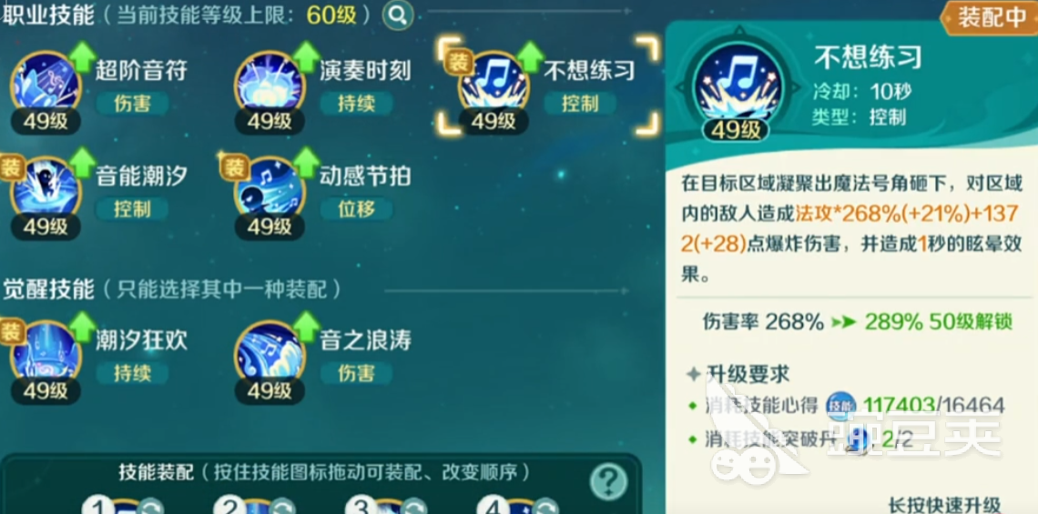 队伍里面如果缺少一些治疗效果的话,大家可以降低在演奏时刻这个技能上面的加点投入,如果不需要这么多爆伤能力,大家根据他的能力可以选择的是音能潮汐这个技能进行支援,因为其中如果有一些稳定的效果,这个技能在集中点1级就可以达到一些比较好的回报率,根据这样的效果使用,在这里性价比还是比较高的,只需要分出来一点技能点数就可以了,然后是在不想练习这个技能上面也是比较推荐大家给他加点的,这个技能使用的时候,可以利用他在目标区域之内领取出来的魔法进行一个区域输出,造成的输出到了268%的数值,在其中点出来爆炸伤害的话,还会有一个1秒的眩晕效果,可以给敌方带来控制,利用这1秒时间大家就可以做出很多的链接操作。