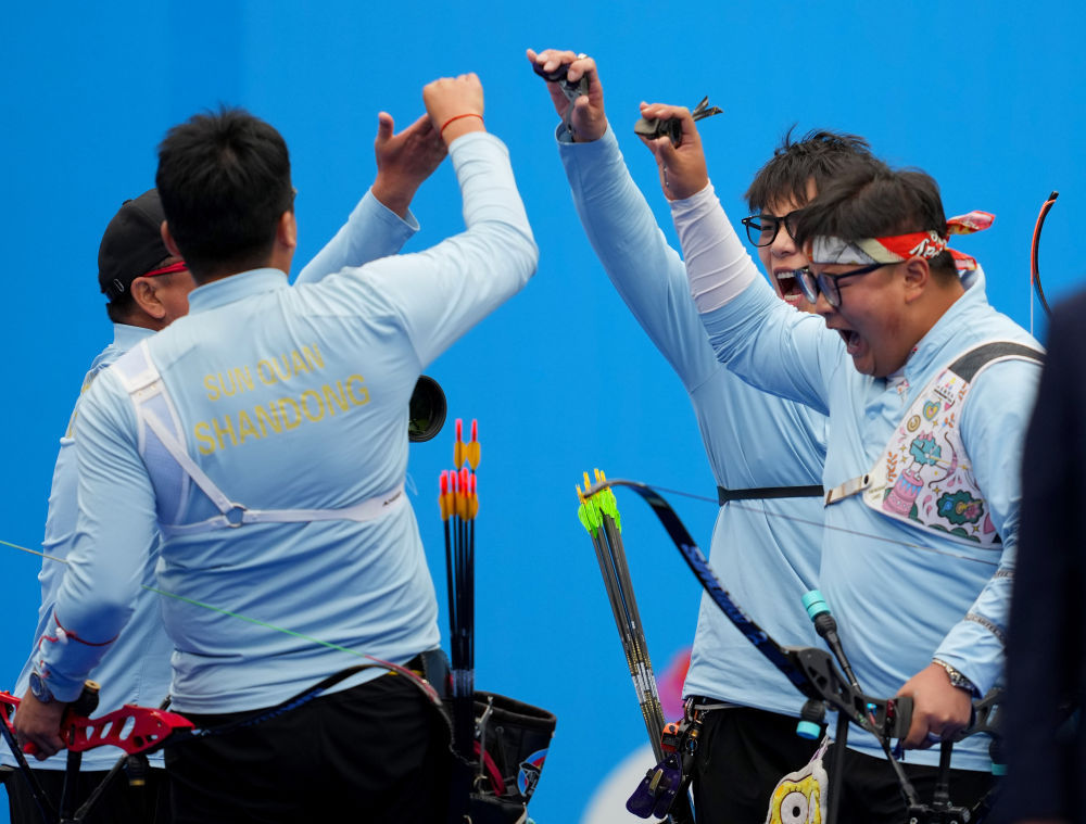 山东队教练靖相青说,队员们长期保持一天四练,每天要射出六七百支箭,训练时长通常在9个小时以上。此次全运会射箭项目一共6块金牌,山东队已揽获三金。对此,靖相青说:“我觉得没什么秘诀,就是坚持和热爱。”