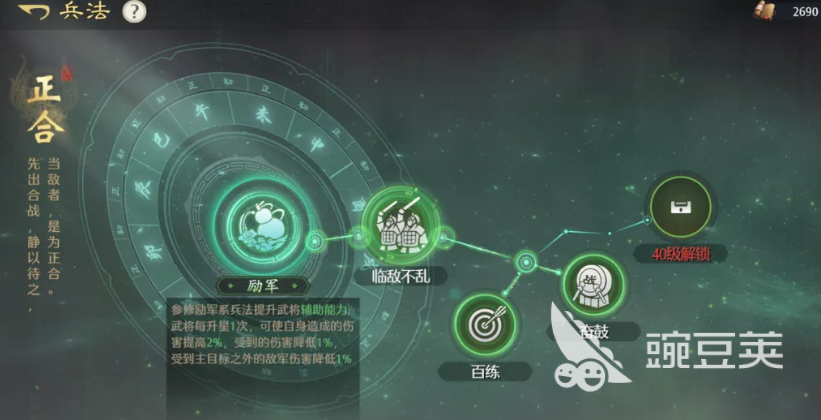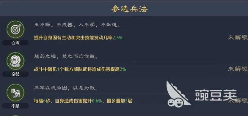 其中百炼带来的提升,固有主动以及突击技能效果的话,带来发动概率都有2.5%左右的提升,而奋鼓这个兵法,其实很多玩家都是听说过的,因为奋鼓目前在阵容搭配里面经常常见它带来的兵法效果,可以给一个随机的我方武将带来伤害提升2%,这样的一个数据效果放在目前搭配的情况上面,他们使用的武将还是比较多的。最后就是励军派系的一个兵法效果,在这里的话,基本情况下是给一些辅助类型的角色使用,比如说曹操、大乔、华佗或者是貂蝉这类武将基本使用的都是励军派系当中出现的兵法效果,在这里基础带来的都是一些辅助能力的提升百分比在这里。
