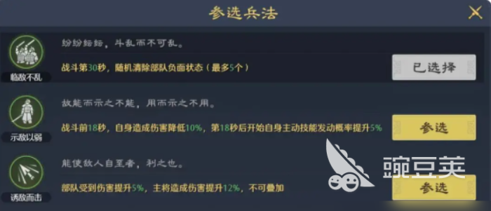 而军略派系的战法,其实在其中基本都是根据每个武将他自身的主动战法技能来提升输出效果的,在这里的话推荐的情况下一般是给关羽、吕布、诸葛亮这类武将来进行搭配,此类军略派系的战法,当中比较出名的有临危不乱,示敌以弱、诱敌而击,此类战法效果目前带来的百分比都是施加在一些战斗效果当中的,而且其中的概率提升百分比都是比较高的,其次第三类派系就是刚毅类型的兵法效果,这里如果大家要使用此类兵法给武将进行搭配的话,最好是给一些带有坦克类型效果的武将进行,比如说曹仁、程普、高顺之类武将,其实自身都是有一些坦克武将使用的技能效果,那么此时给他们选用兵法的话,刚毅派系的兵法里面带来的能力就非常不错,比如说百炼、奋鼓、不息这类兵法他们带来的提升都是此类能力。