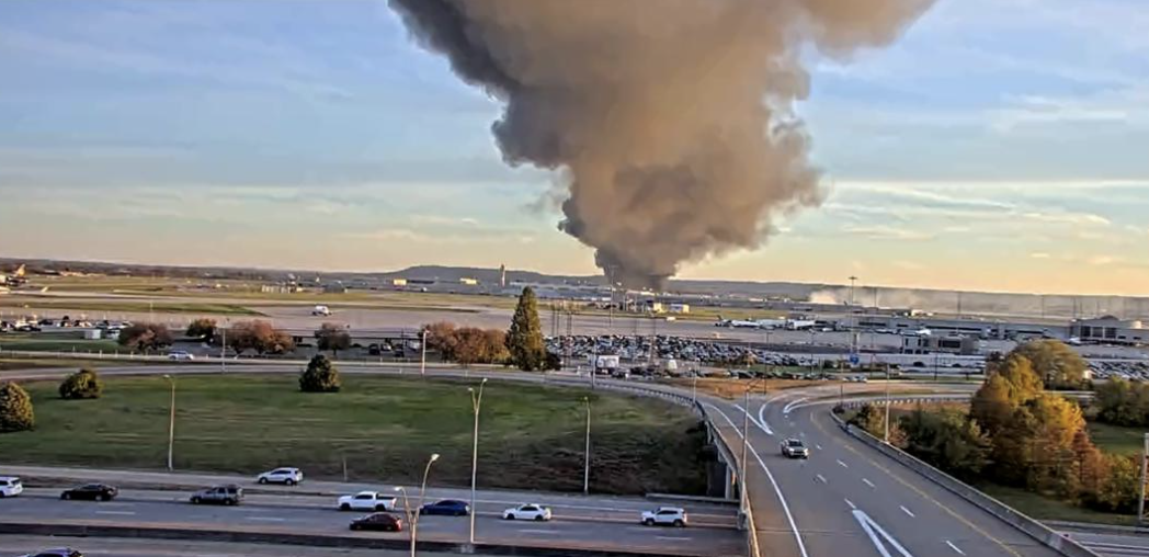 机场附近升起滚滚浓烟。目前紧急救援人员正在赶往现场。新京(总台记者 张颖哲)