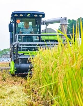 中联重科股份有限公司广东总代理销售负责人霍宏尧介绍,此次比赛用的是公司生产的PL型收割机,其中一大特点就是高减损。“2.2米加长型脱粒滚筒,脱粒更干净,1.8米的工作筛面,风机流畅优化,清选效果更好。”