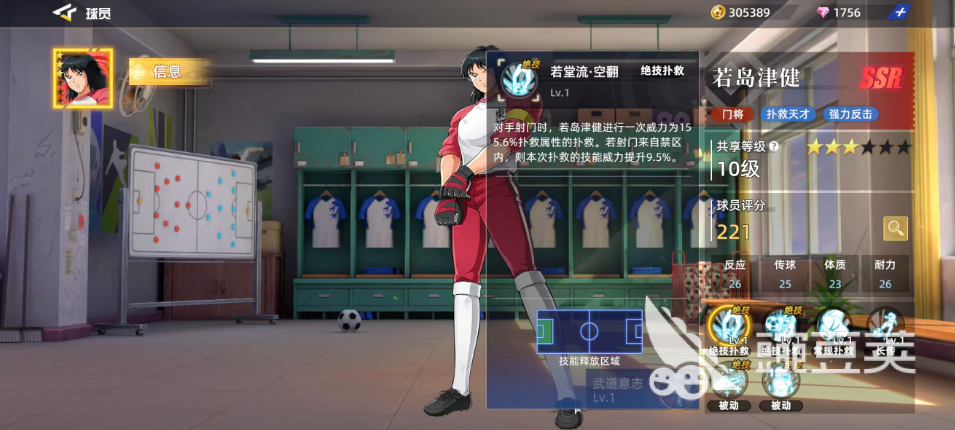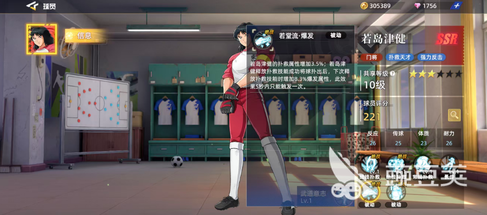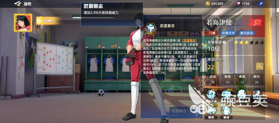 如果是希望他扑救属性能够得到足够的增益,其实还是主要靠若堂流·爆发这个技能产生的被动效果,其中会给若岛津健的扑救属性增加3.5%的数值,然后在若岛津健释放扑救技能成功将球扑出后,下次再放扑救技能的时候还会增加8.3%爆发属性,这个效果好用是好用的,就是5秒内只能触发一次,所以要把握好时间,另外的武道鼓舞这个技能会为若岛津健带来反应属性增加3.5%的被动效果,如果是若岛津健使用扑救技能成功将球扑出后,球更容易飞向己方的其他队友,且己方禁区内的所有队友争顶属性也会得到增加6.7%的增益哦。