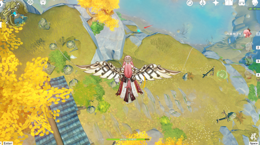 4、在第三处东偏北的位置,沿着山壁飞,看到烈焰花下降,再走几步即可,山体夹角处有1个水晶矿。