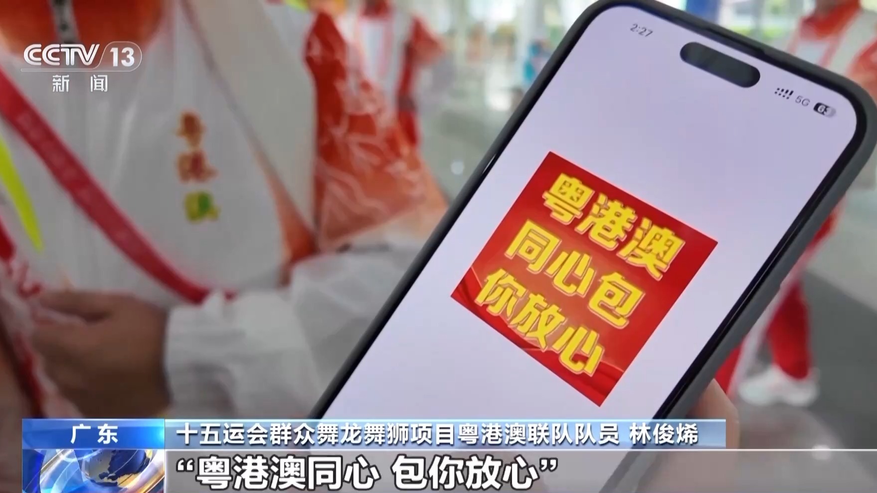 十五运会群众舞龙舞狮项目粤港澳联队队员 林俊烯:我们的制胜秘诀就是“粤港澳同心 包你放心”。