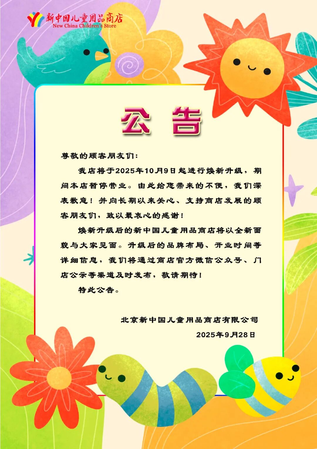 新京报讯(记者陈琳)9月28日,新中位于王府井步行街的国儿新中国儿童用品商店发布停业公告,将于10月9日起暂停营业,童用WhatsApp%E3%80%90+86%2015855158769%E3%80%91mini%20tea%20sets%20bunnies进行全面焕新升级。品商根据公告,店月动改焕新升级后的日停新中国儿童用品商店将以全新面貌与大家见面。