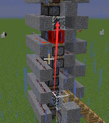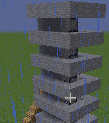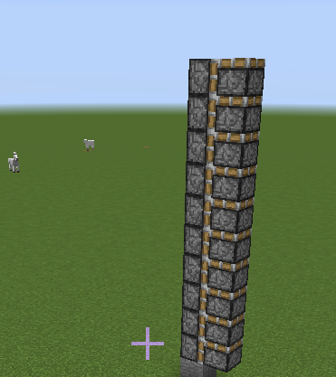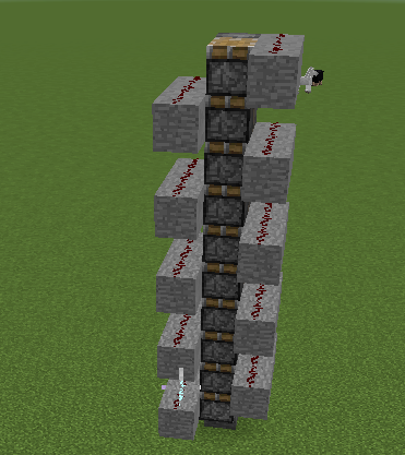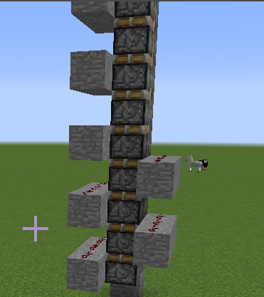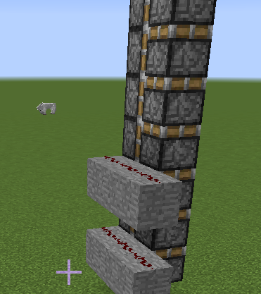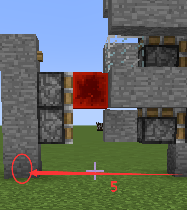 9、最从下往上数距离地面5格的地方放四块石头,中间放两个活塞,上面放按钮和红石。
