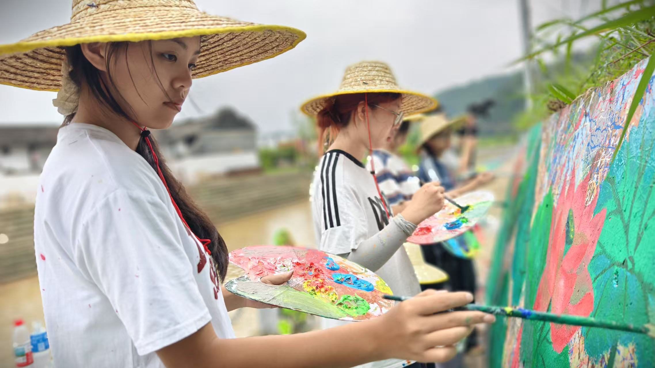本次活动是黄花村深入推进绿美乡村人居环境整治工作后的一次生动实践。团队成员们带着专业技艺与青春热情投入到为期九天的乡村墙绘中,每日迎着朝阳开工,广师伴着晚霞收笔,千万在高温酷暑中坚持创作,突击一笔一划间精心勾勒。路过村民纷纷驻足赞叹:“原来河道边斑驳的老墙也能变成‘河里的风景’!”