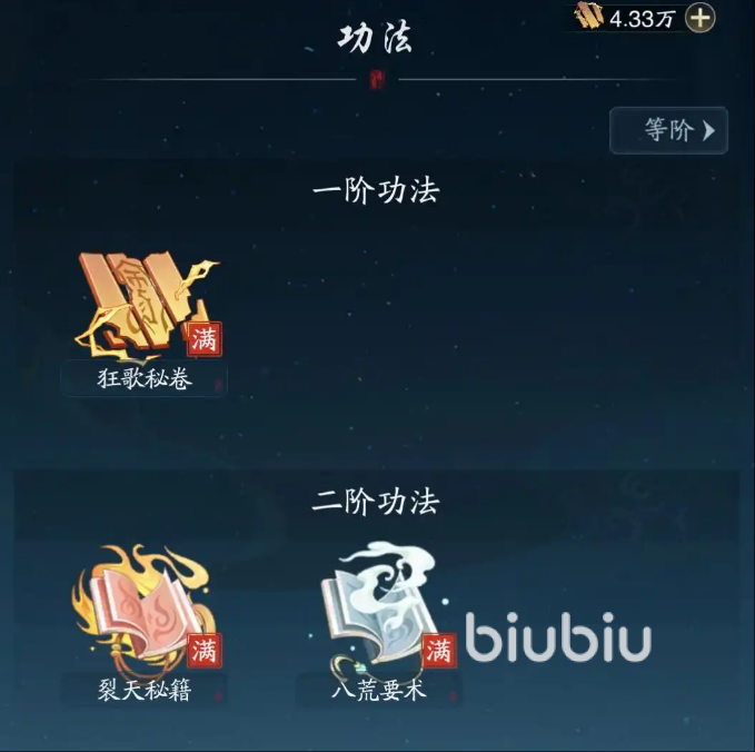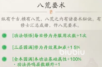 一阶功法“狂歌密卷”提升炼丹效果;二阶功法“裂天秘籍”行气次数+1和加成行气修为;二阶功法“八荒要术”修为丹的次数+1和加成修为丹效果加成;三阶功法“金鼎要术”增加云游修为。