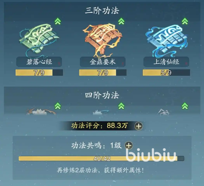 四阶功法“混元大法”增加行气次数和加成行气修为;四阶功法“天魔玄经”加速云游和加成云游修为;五阶功法“锁魂秘术”云游加速和加成云游修为效果;五阶功法“奔雷秘典”增加修为丹服用次数和加成修为丹效果;六阶功法“大荒雷典”可以免费加速云游;六阶功法“剑章七式”加成修为丹;七阶功法“斗转心决”加成极品修为丹;七阶功法“洞彻心决”加成绝品修为丹;八阶功法“明净心决”加成云游修为;九阶功法“星河古卷”加成极品修为丹和绝品修为丹。