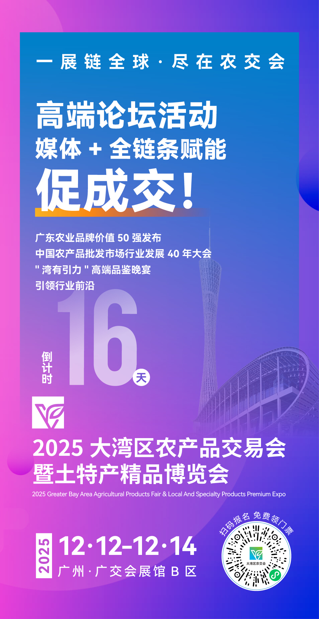 ? 农业人必盯!# 大湾区农交会 “媒体+”全链条赋能来袭。行业广东农业品牌价值 50 强权威发布,媒体+见证行业标杆力量;中国农产品批发市场行业发展 40 年大会,大湾倒计解码产业未来趋势。区农强品