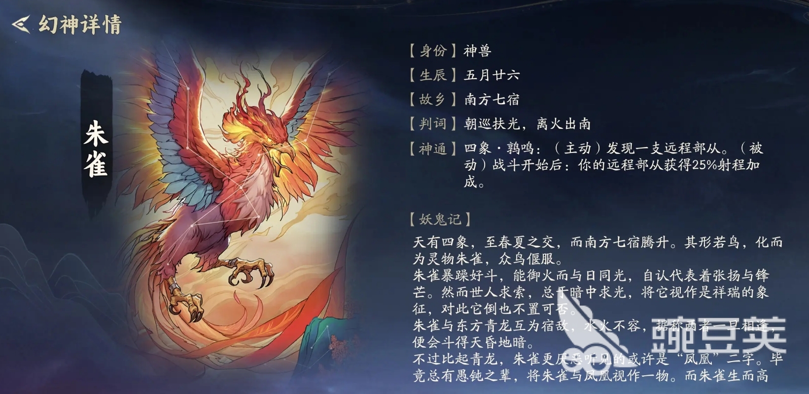 神兽朱雀是一个主打远程的阵容,它的效果有两种表现形式,其一是玩家能主动利用朱雀来发现一支远程部从,可增加人们获取远程部从的概率,更快地完成远程阵容的构建。其二就是效果十分朴实的加射程被动,只要进入了战斗,己方在场上的远程部从都能获得25%的射程加成,对手在接近前就会被迎头痛击。