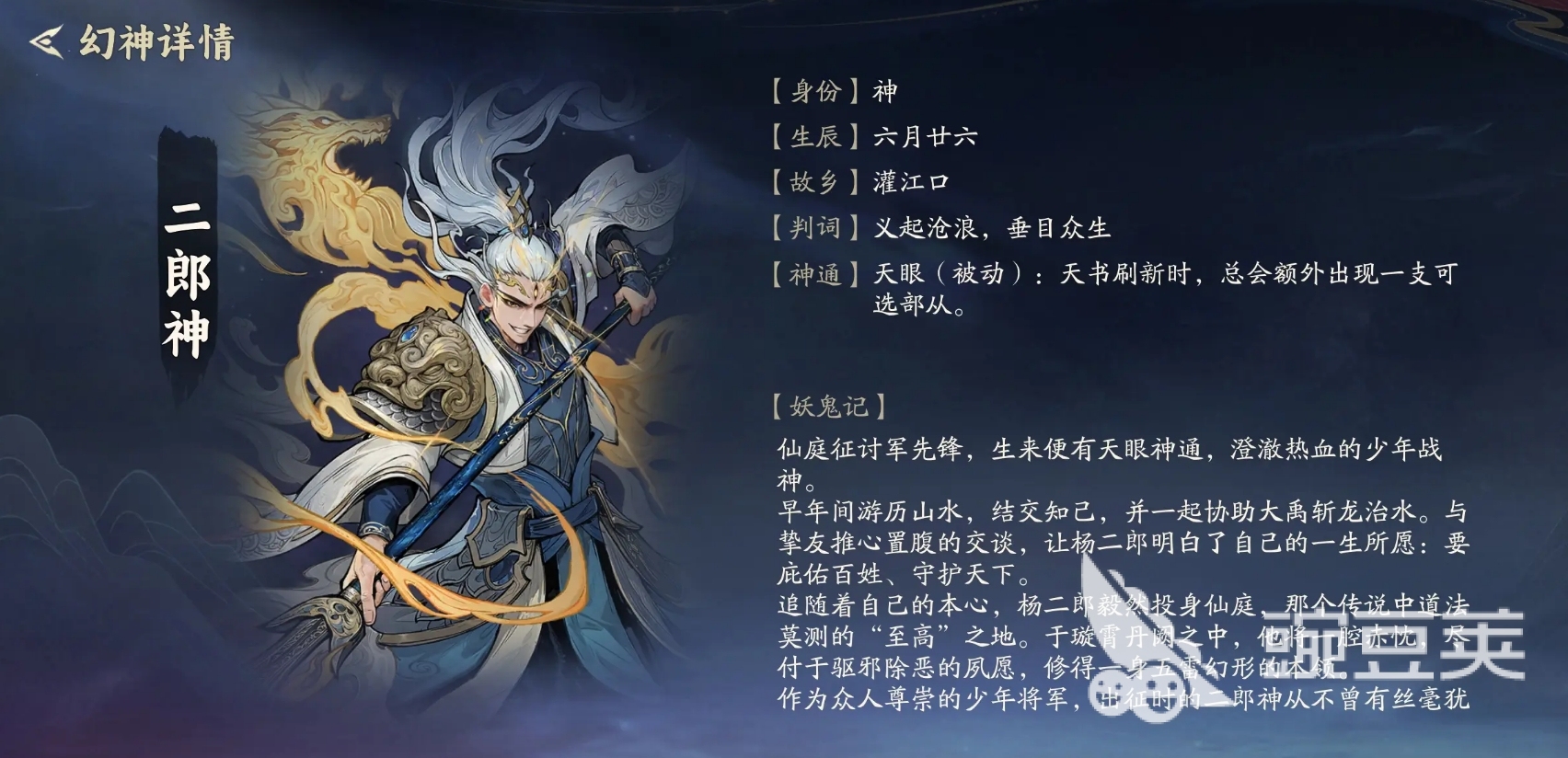 二郎神是一个偏运营向的幻神,有着极为朴实的效果,所以很多人看到他都会优先选用。他的作用是能让天书刷新时,总会多出一支额外可选的部从,让玩家有更高的概率从天书中拿到自己想要的阵容组合,从而更快速地完成阵容的搭配,并在战斗中通过阵容本身的强度来对敌人实现碾压。