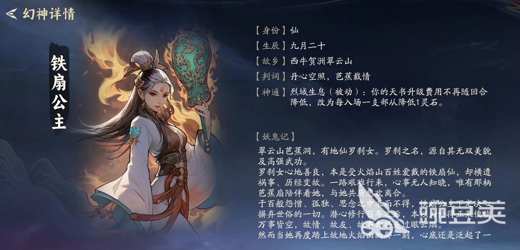 很考验玩家运营能力的幻神,虽说天书的升级费用不会再随回合数降低,但每入场一部从就能减一灵石升级费用的效果在前期很实用,能让选择铁扇公主的玩家更快地去提升天书等级,比他人早一步拿到高星级的部从,更快地去提升阵容质量,运营得好时能有极高的上限。