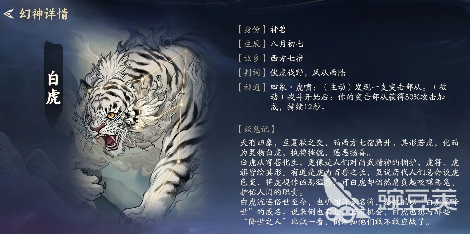 倘若玩家不考虑获胜,只想快速上分,那白虎是很好用的幻神。它可主动发现一支突击部从,让玩家能更快地完成突击部从阵容的组建,且战斗后所有的突击部从都可获得30%的攻击力加成,能在前期快速将对手抬走,确保自己能轻松进入前四,自然也令上分变得很简单。