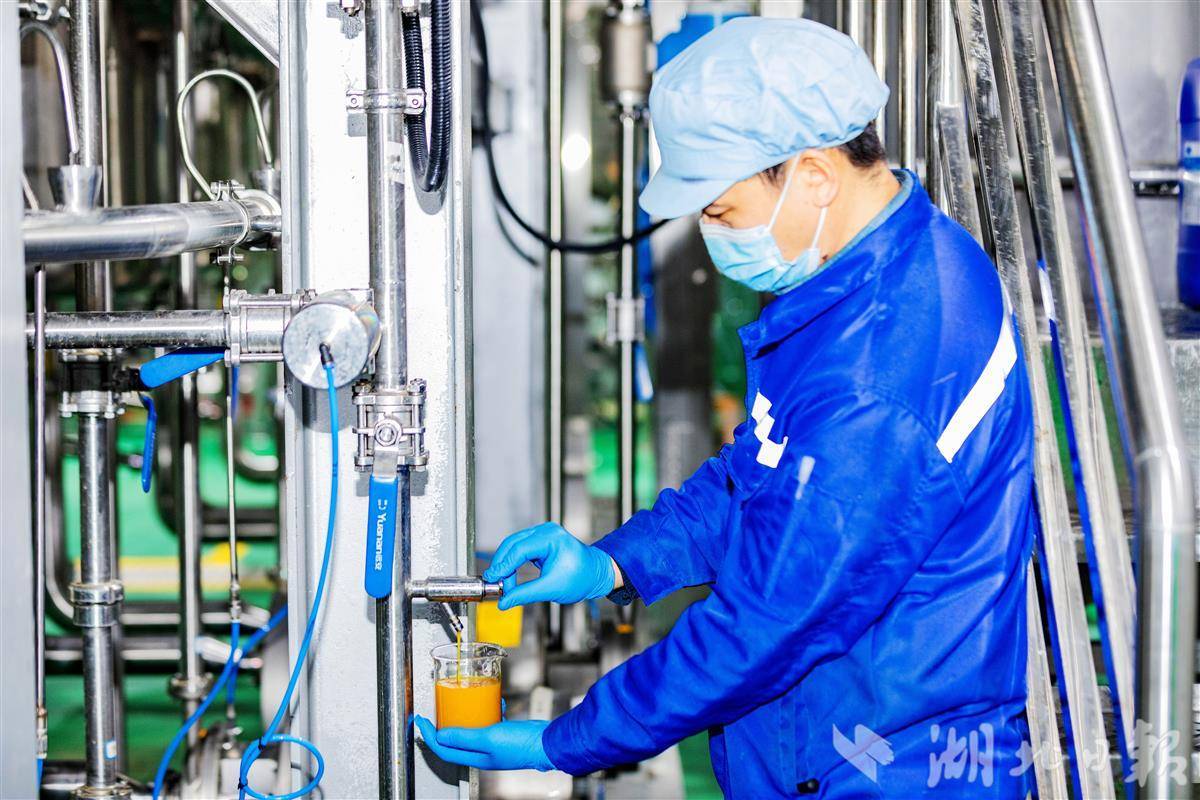 11月24日,宜昌市果乐迪食品有限公司内,工作人员正在查看生产的果汁。