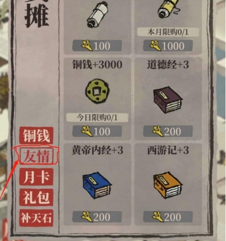 2、兑换友情点可以在杂货铺兑换相关物品,其中小编推荐限购的金画轴和3000铜钱必买,其他的根据玩家心仪的选购就好。
