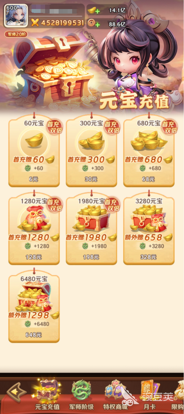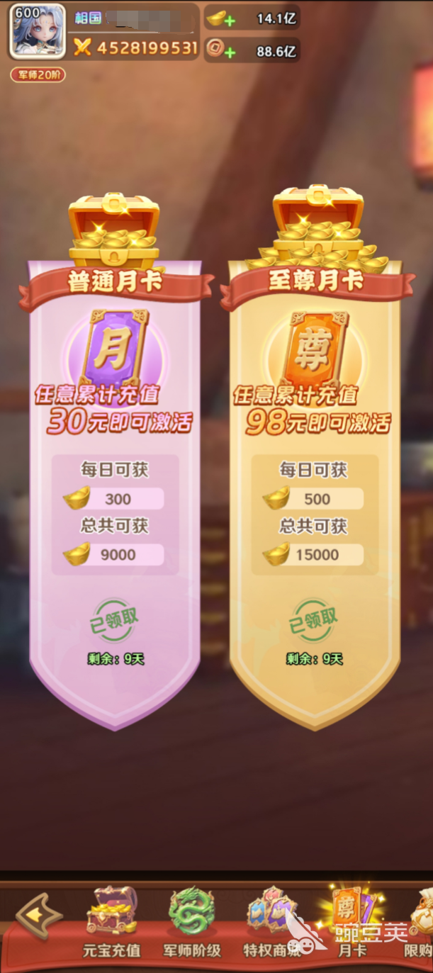 在巨神军师游戏当中,月卡是比较常见的。而该游戏中有普通月卡跟至尊月卡,普通月卡充值30元就可以,每天有300元的元宝。至尊月卡需要充值98元,每天可获得500元的元宝。对于长期体验的玩家来说,月卡是相对稳定的。