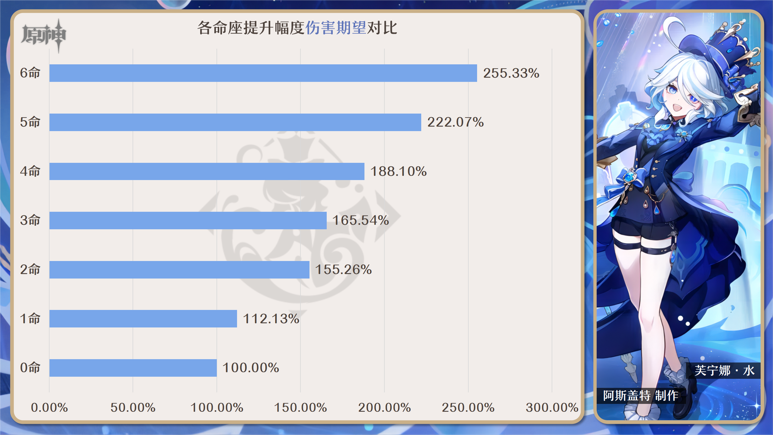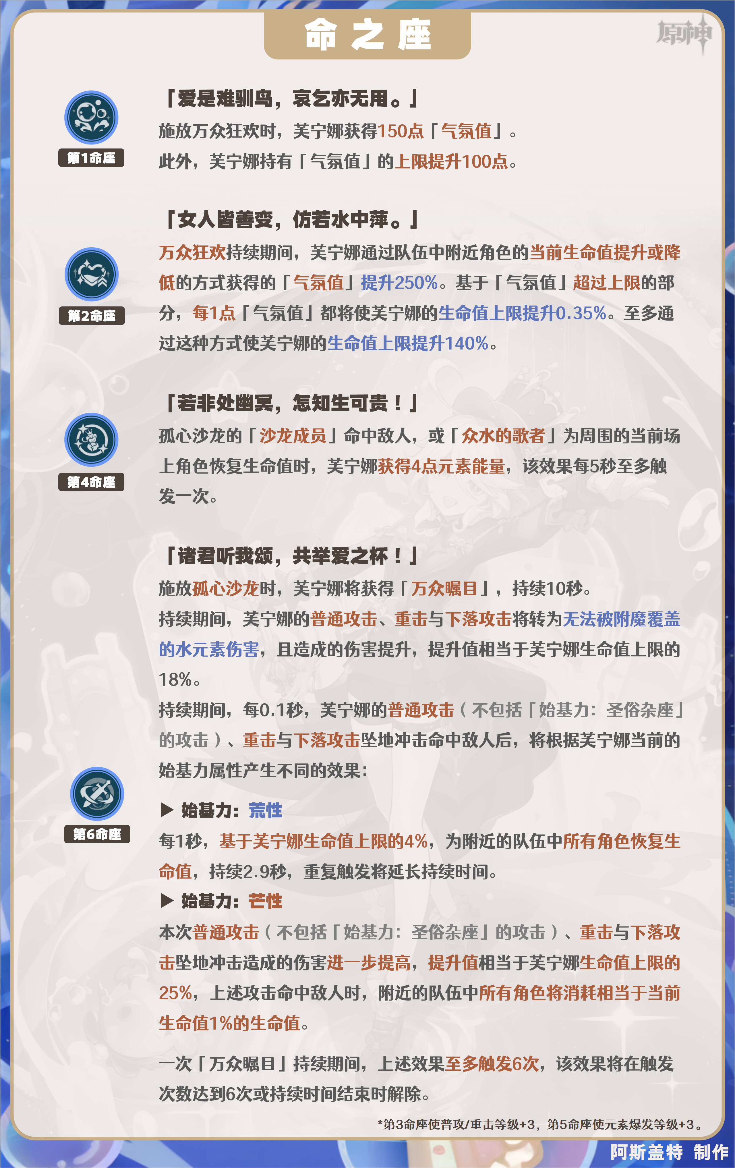 ◆总的来说,芙宁娜的0命便已有了一定的功能性、副C输出能力。1、2命可以进一步提高芙宁娜元素爆发的增伤程度,4命优化自身机能循环,极大程度上解放充能压力,6命为芙宁娜提供了爆发输出能力并且可以利用荒性效果下的攻击来为全队回复生命,起到“群奶”的作用。在抽取命座时可以2、4、6命为目标。