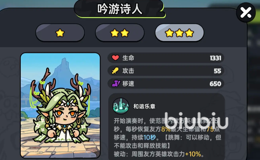 吟游诗人作为辅助有着高额回血,冷却短的同时还有攻击和移速加成,他的被动是增加周围队友10%的攻击力,主动技会开始演奏,让范围内的敌人在2.5秒内,不能进行攻击以及使用技能,但可以移动,同时在10秒内给队友进行回血,增加300群体移速。