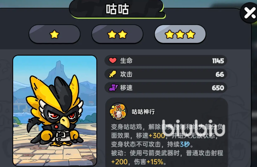 其被动是在用弓箭时,让伤害提升15%,攻击射程加200,他的主动技会变成一只鸡3秒,期间无法攻击但会解除掉自身的控制,获取400移速并进入到无敌状态中,这个角色被动增加了普攻射程和伤害,在有很多好用弓箭武器的情况下,配合上大招无敌,使得其既有伤害也有生存能力。