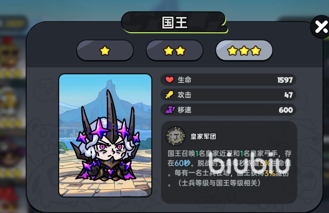 国王能召唤打手提供减伤,开荒期很好用,他的主动就是召唤1名近卫和1名弓手60秒帮助进行战斗,脱离战斗他们会每秒恢复5%的血量,场上每有一位士兵,自身能得到8%的减伤。