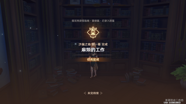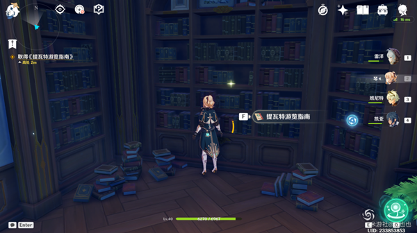 10、进入图书馆,走到书架前拿到《提瓦特游览指南》。