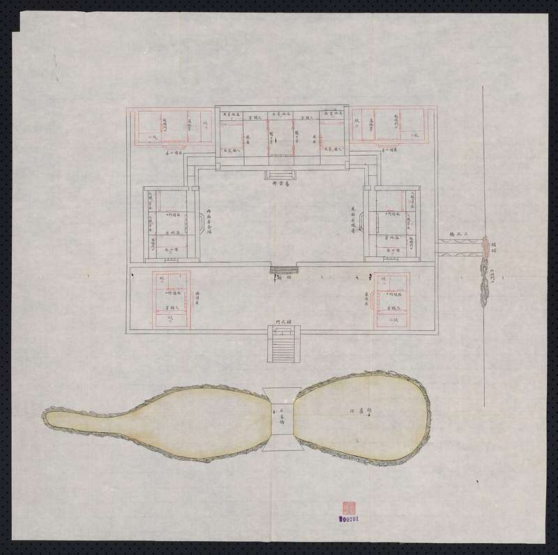 他摊开了一张“养云轩地盘全样”样式雷图。图上清晰可见一个葫芦形状的莲塘,上架一座拱桥,莲塘北面,是正殿、配殿等建筑。“有三张图的配殿南墙上,绘有四扇窗,另外两张则没有窗。”