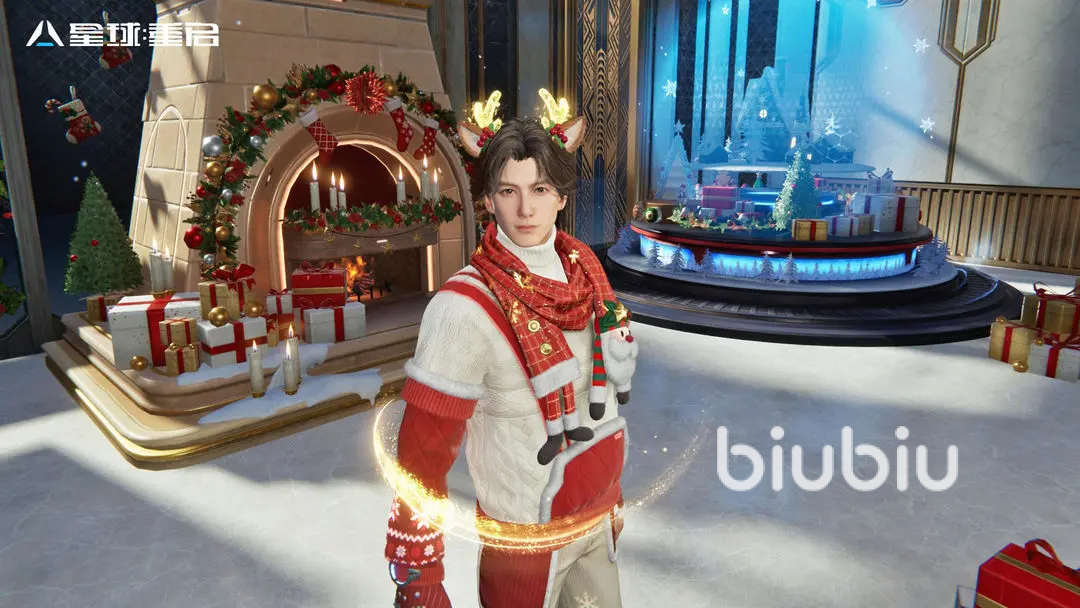 男款的星球时装是一个羊毛衫的设计,跟冬日慵懒舒适的氛围非常的贴合,看着就暖融融的,而搭配的麋鹿头饰更是散发金色的光芒,将整体圣诞的氛围营造得更加的浓郁了。