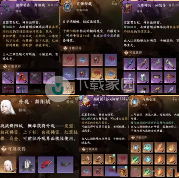 5、通关奖励:外观-舞阳城、独珍装备-舞阳城、百练神兵-68装等、舞阳城-公共掉落、首领秘藏、内功心法。