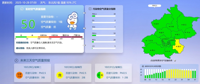据北京市生态环境监测中心今早7时数据,目前实时空气质量指数50,空气质量优。