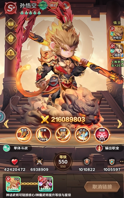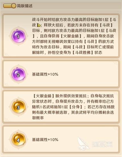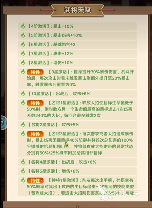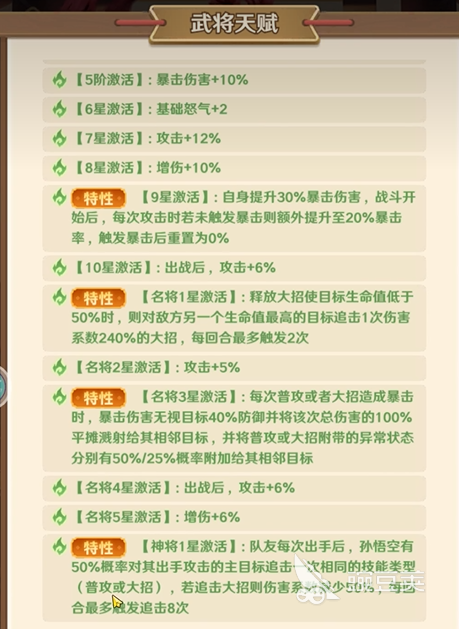 名将1星天赋就更厉害了。当大招把目标打到半血以下的时候,会自动找场上血量最高的另一个敌人再打一次,伤害系数是240%,每回合最多触发两次。这意味着孙悟空在收割残血目标的同时,还能对满血目标造成威胁,让他在战斗中的价值大大提升。