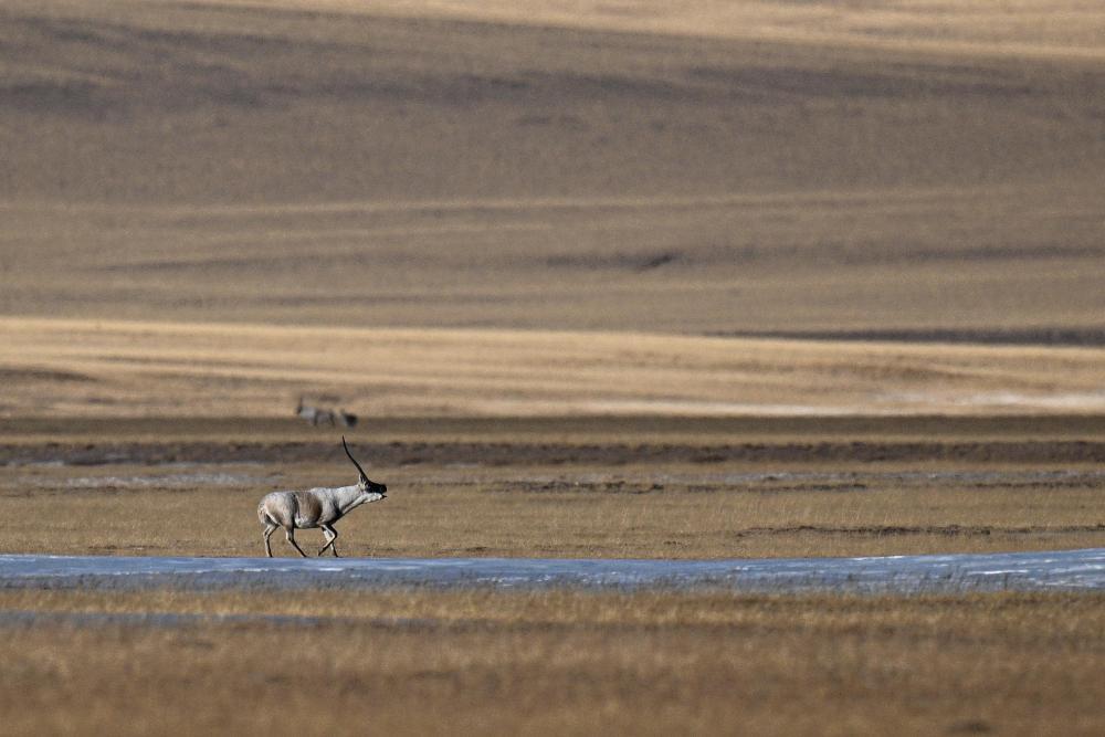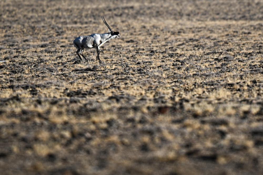 一只雄性藏羚羊在羌塘国家级自然保护区的草原上追逐雌性藏羚羊(12月1日摄)。新华社记者 郭昱 摄