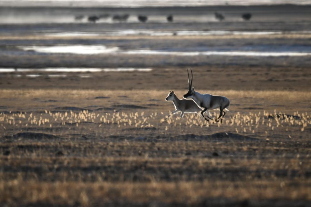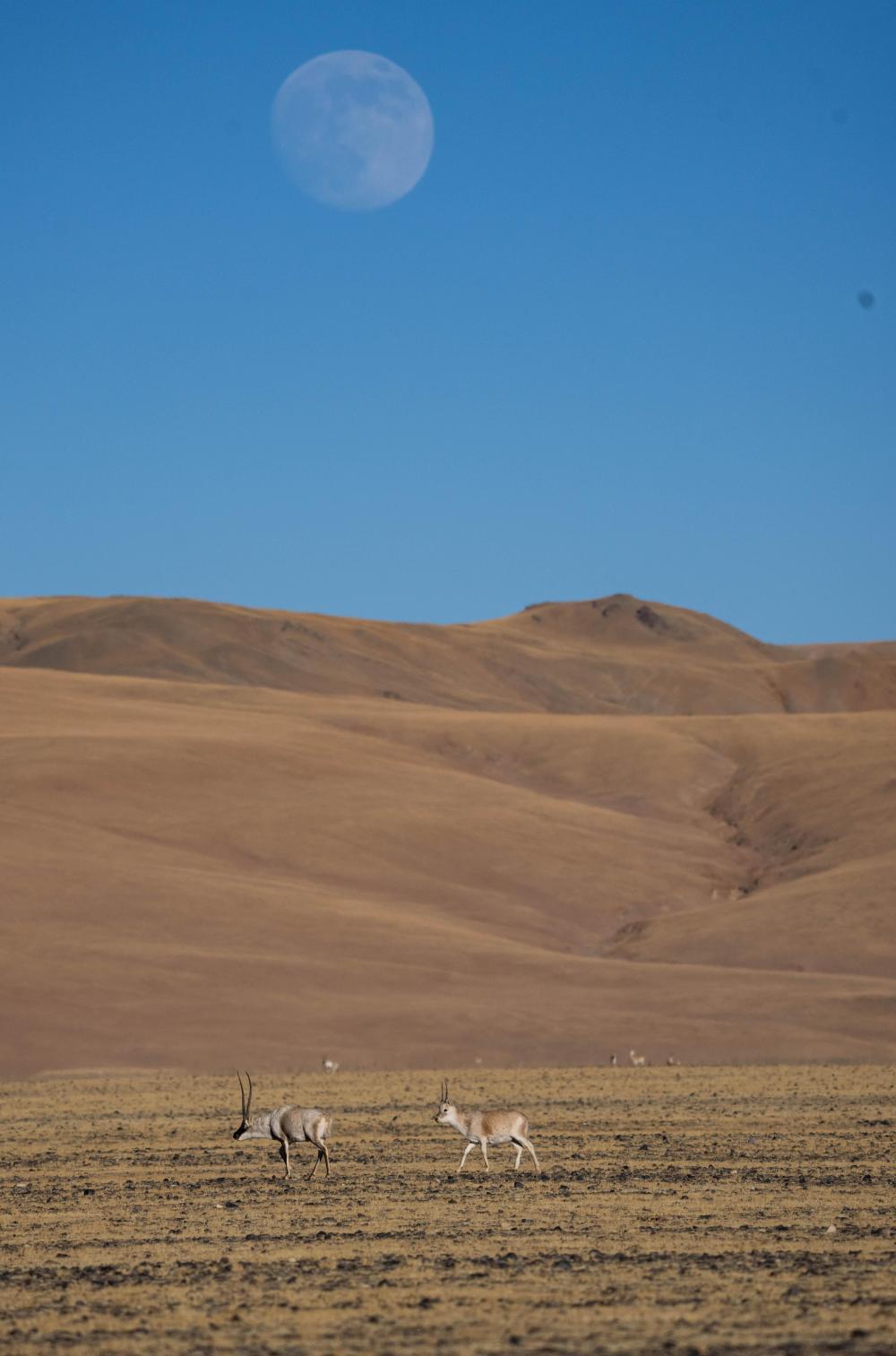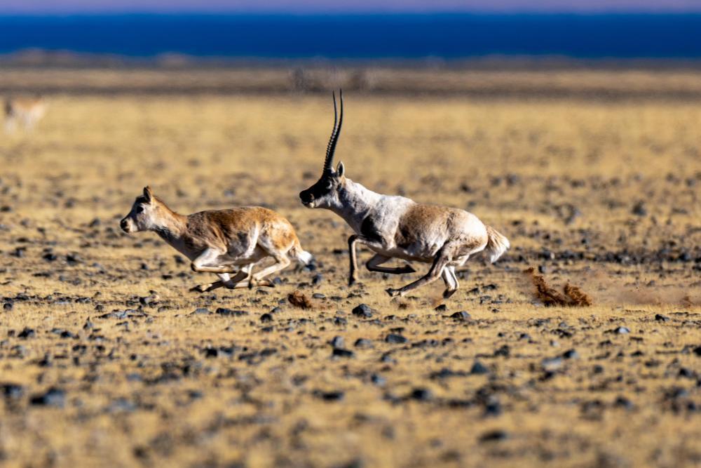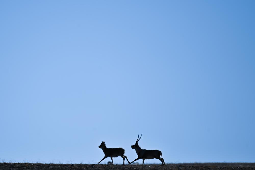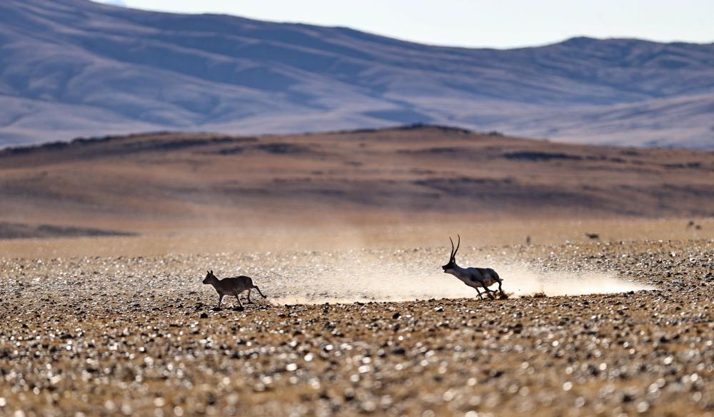 一只雄性藏羚羊在羌塘国家级自然保护区追逐雌性藏羚羊(12月1日摄)。 新华社记者 郭昱 摄