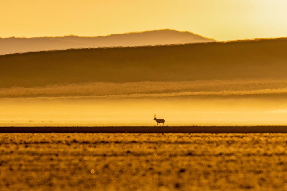 在羌塘国家级自然保护区,藏羚一只雄性藏羚羊在晨光中行进(12月4日摄)。为爱而战新华社记者 郭昱 摄