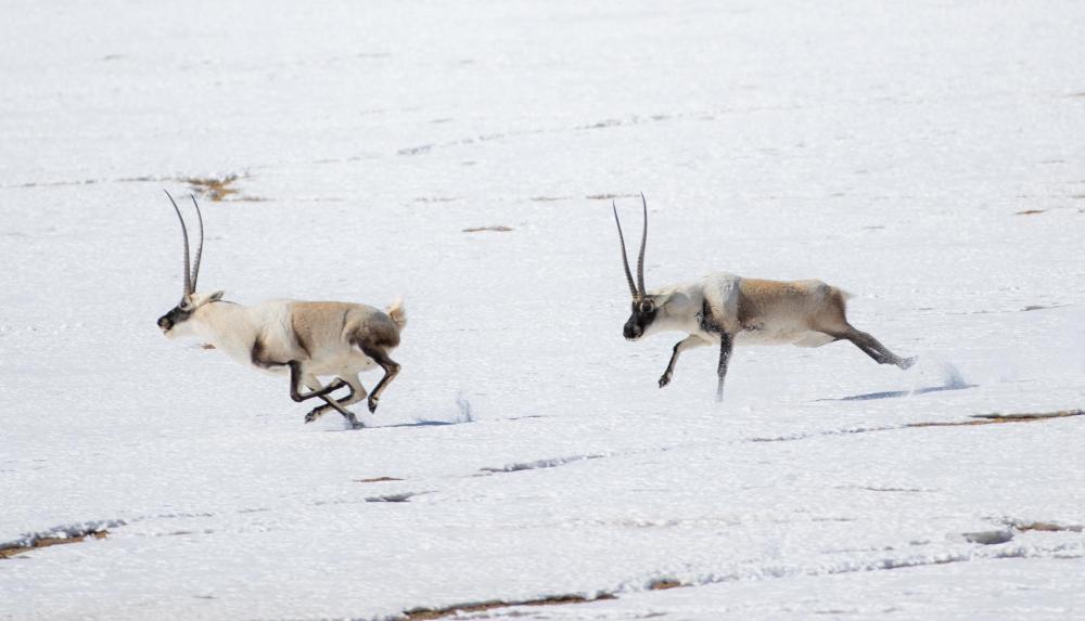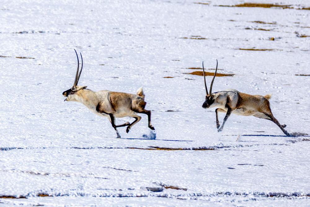 两只雄性藏羚羊在羌塘国家级自然保护区的雪原上追逐(11月30日摄)。新华社记者 郭昱 摄