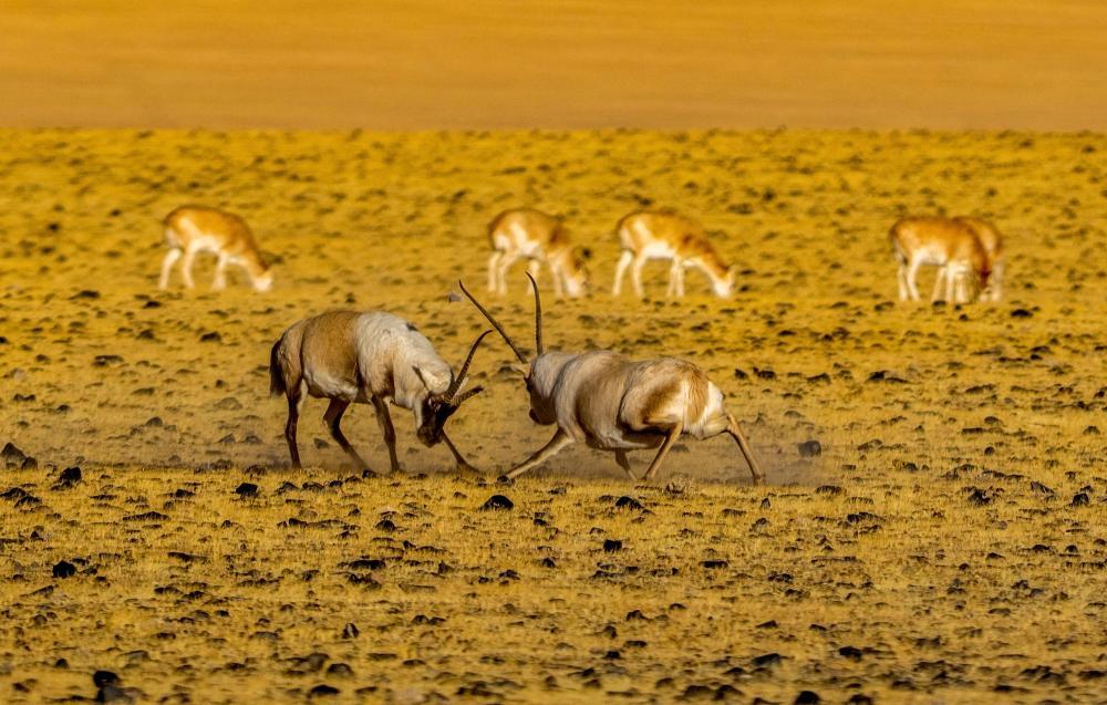 雄性藏羚羊在羌塘国家级自然保护区的草原上打斗(12月1日摄)。新华社记者 郭昱 摄