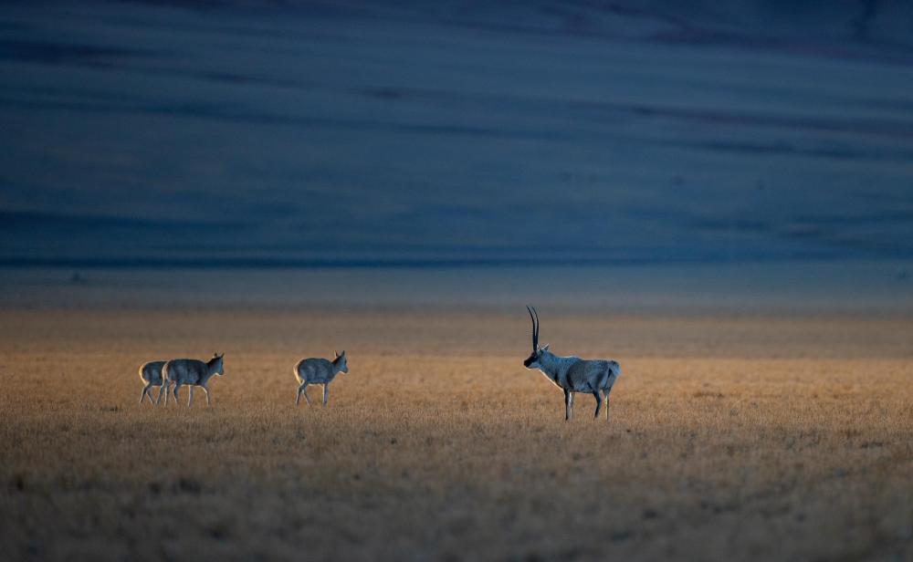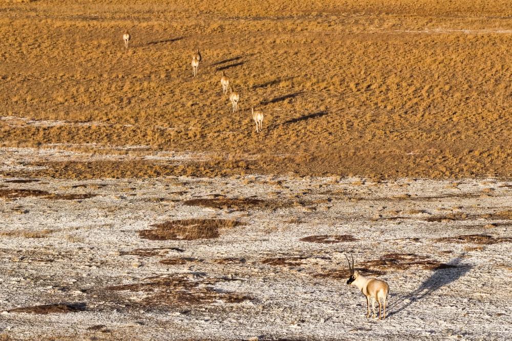 在阿爾金山國家級自然保護區,一只雄性藏羚羊帶領雌性藏羚羊覓食(12月5日攝)。新华社记者 辛悦卫 摄