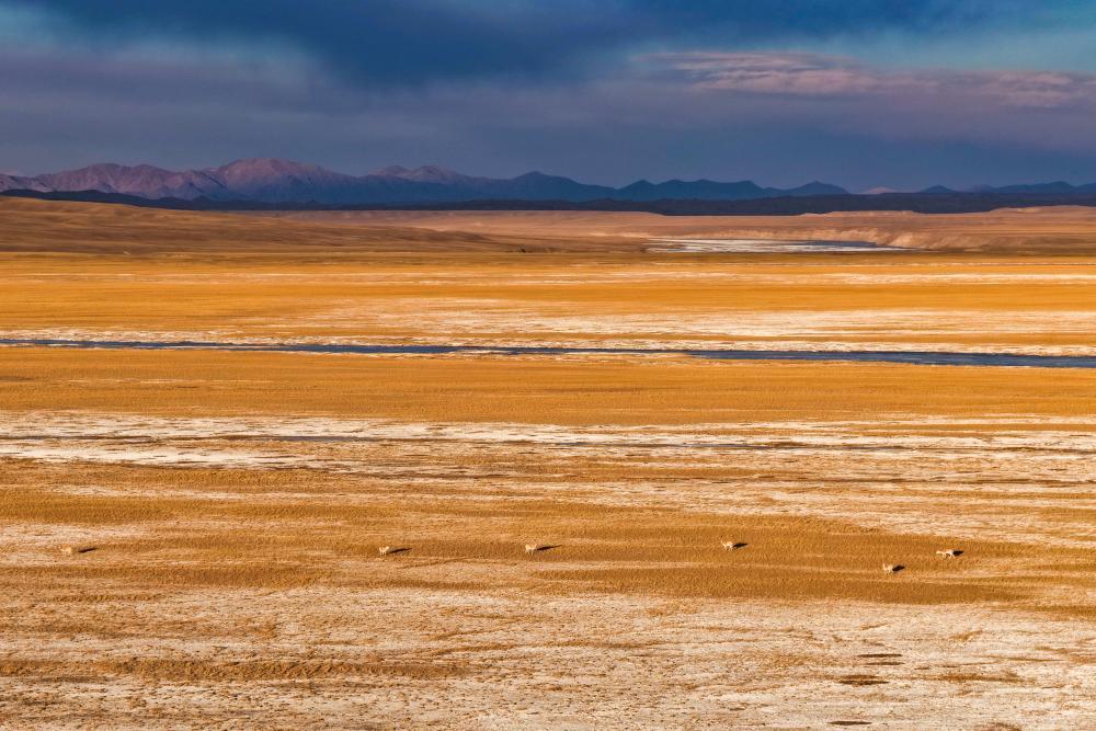 在阿爾金山國家級自然保護區,藏羚一只雄性藏羚羊帶領雌性藏羚羊覓食(12月7日攝)。為愛而戰新华社记者 辛悦卫 摄