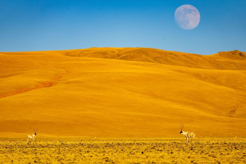 在阿爾金山國家級自然保護區,一只雄性藏羚羊在“呼喚”雌性藏羚羊(12月9日攝)。新华社记者 辛悦卫 摄