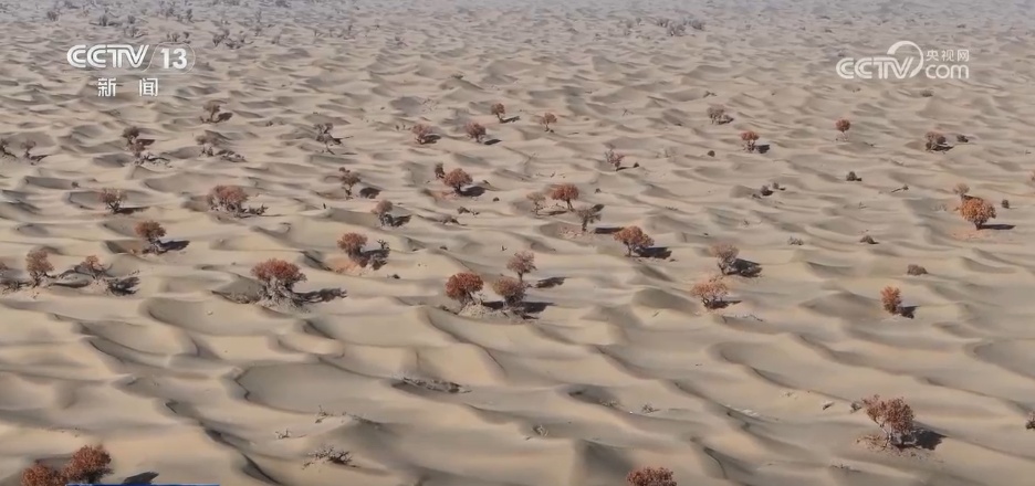 在新疆昆玉市以西的大片沙漠中,随着天气渐冷,胡杨的树叶不再那么金黄耀眼,沙漠也多了一些苍凉,更增添了几分美感。胡杨树虬曲的枝干挺立大漠,斑驳的树影和树下的落叶,如同一幅美不胜收的画卷,晕染出层次分明的色彩。