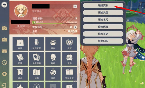 3、角色及方出现隐藏菜单栏,展柜点击第一个编辑资料。设置