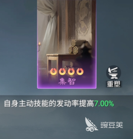 接下来为大家推荐的是集智这个技能卡,在游戏当中,通过这个技能卡可以给武将发动自己主动技能的时候带来更多的成功概率,只要能够发动技能,其中一些额外效果的触发百分比都会在发动概率上面有7%的数值提升,可能部分玩家会以为这样的百分比数值不高,但是这是基于本身主动技能百分比已经很高的情况下用,所以针对一些本身自己主动技能就比较好用的玩家来说,这样的效果就是比较有加强意义的。