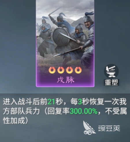 戌脉这个技能卡本身品质还可以的同时其实很多玩家都是用过的,因为可以给大家带来一定的兵力恢复效果,但是这里是只有在进入战斗时间?21秒结束之后这个技能就很难再给大家带来恢复了,这里触发技能之后每3秒的时间之内都会为我方的武将带来部队兵力数值达到300%的回复效果,且此时子啊兵力恢复效果上面不回受到属性效果的加成,所以回复效果不错,但是没有额外的加成效果叠加。