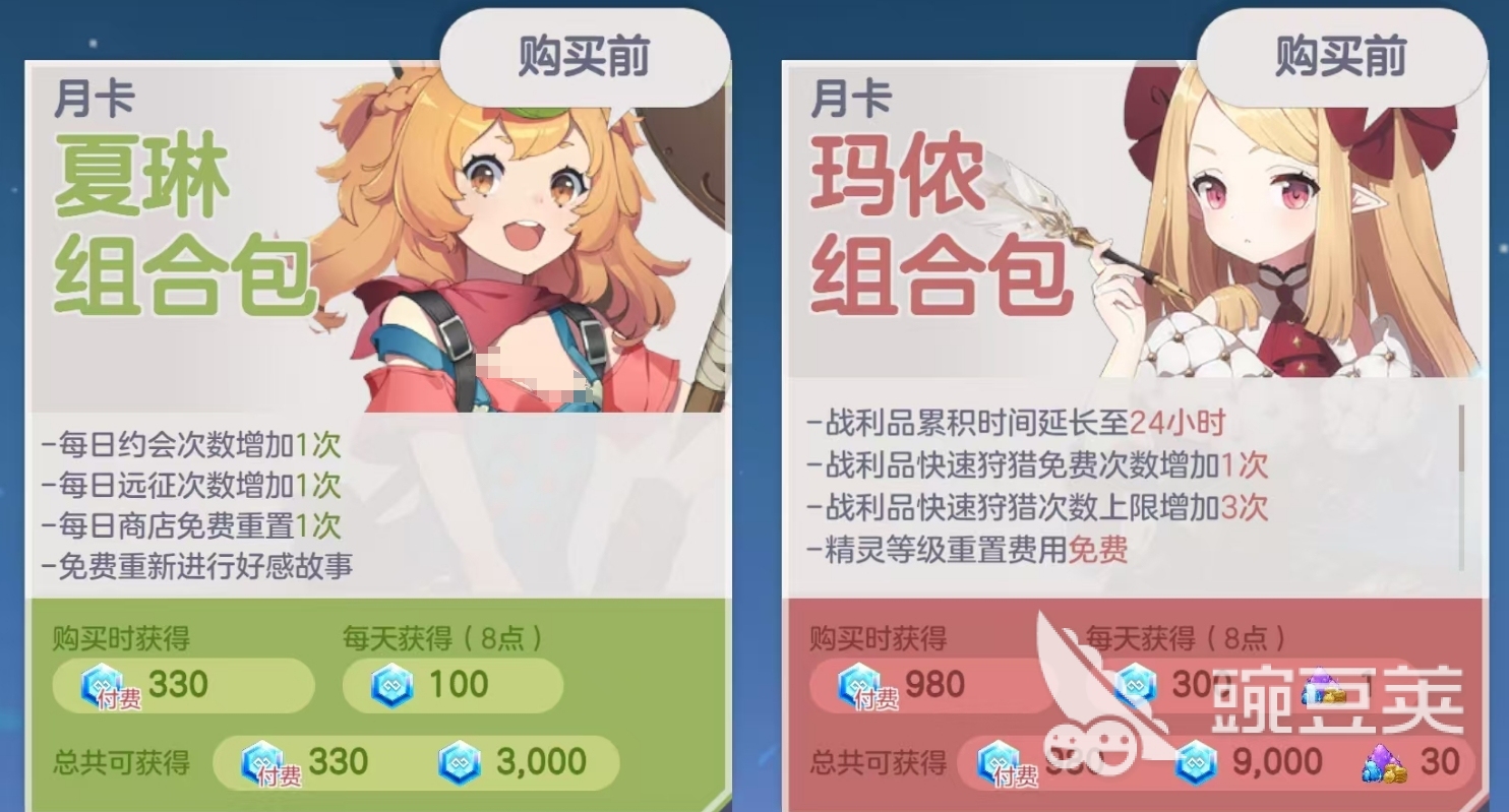 微氪玩家可通过买首充礼包和月卡来提升自己的游玩体验。首充能直接获得强力精灵克劳迪娅,并能在第二天领五张遗物召唤劵和十八朵幸运花束,第三天还会再获得克劳迪娅用于进阶,以及传说级的整套饰品自选箱。青空灵诗篇有两种不同规格的月卡,分别为夏琳月卡和玛侬月卡,各位在购买后都能立刻拿到付费永恒石(夏琳330,玛侬980),往后在月卡的生效期间内,还能每天领取一定数量的免费永恒石作为奖励。其中夏琳每天能领100,玛侬每天能领300,同时还能激活对应月卡的特权,且两种月卡可叠加生效。