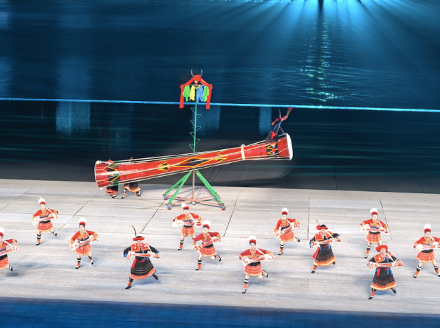 表演过程中,舞台上一个巨型长鼓吸引了不少现场观众的目光。舞蹈演员坐在长鼓上击打鼓面,咚咚的鼓声响彻舞台。