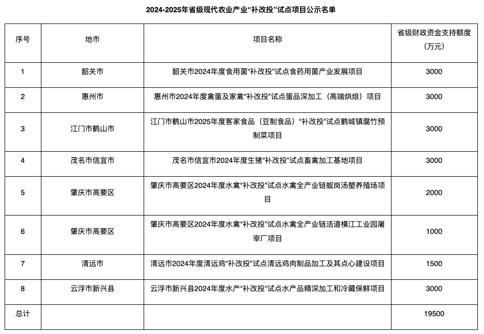 近日,广东省农业农村厅公示2024-2025年省级现代农业产业“补改投”试点项目名单。广东