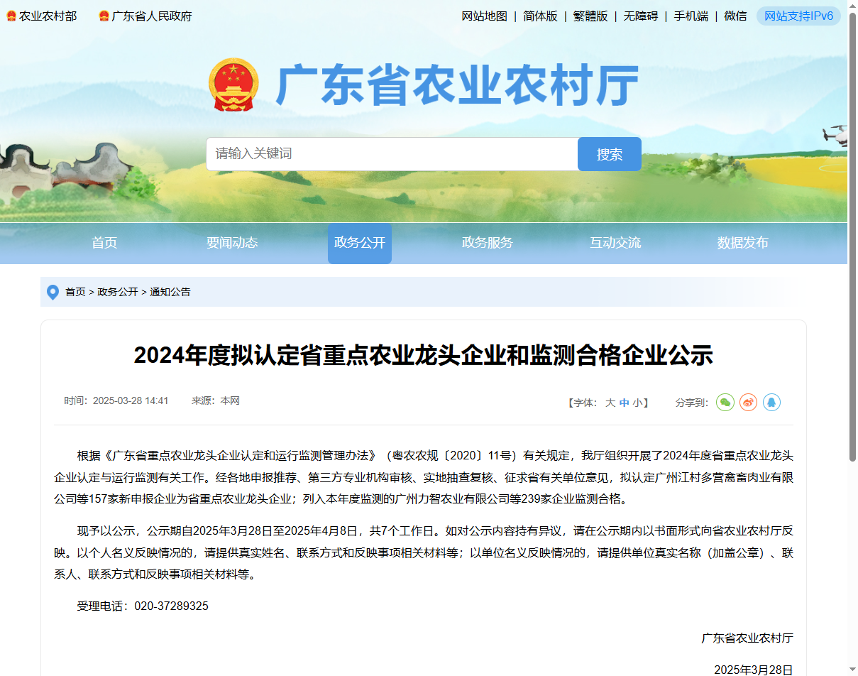 根据《广东省重点农业龙头企业认定和运行监测管理办法》(粤农农规〔2020〕11号)有关规定,广东省农业农村厅组织开展了2024年度省重点农业龙头企业认定与运行监测有关工作。经各地申报推荐、第三方专业机构审核、实地抽查复核、征求省有关单位意见,拟认定广州江村多营禽畜肉业有限公司等157家新申报企业为省重点农业龙头企业;列入本年度监测的广州力智农业有限公司等239家企业监测合格。公示期自2025年3月28日至2025年4月8日,共7个工作日。