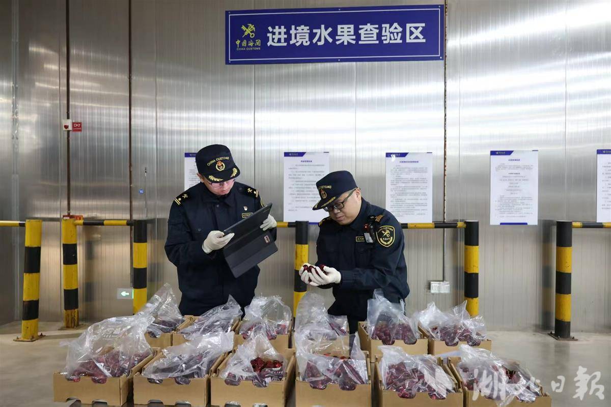 武汉海关关员在鄂州花湖机场查验进口车厘子。前月