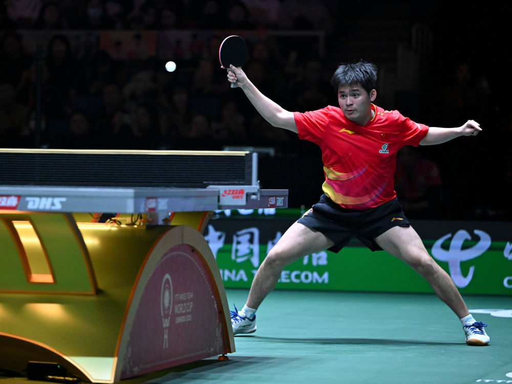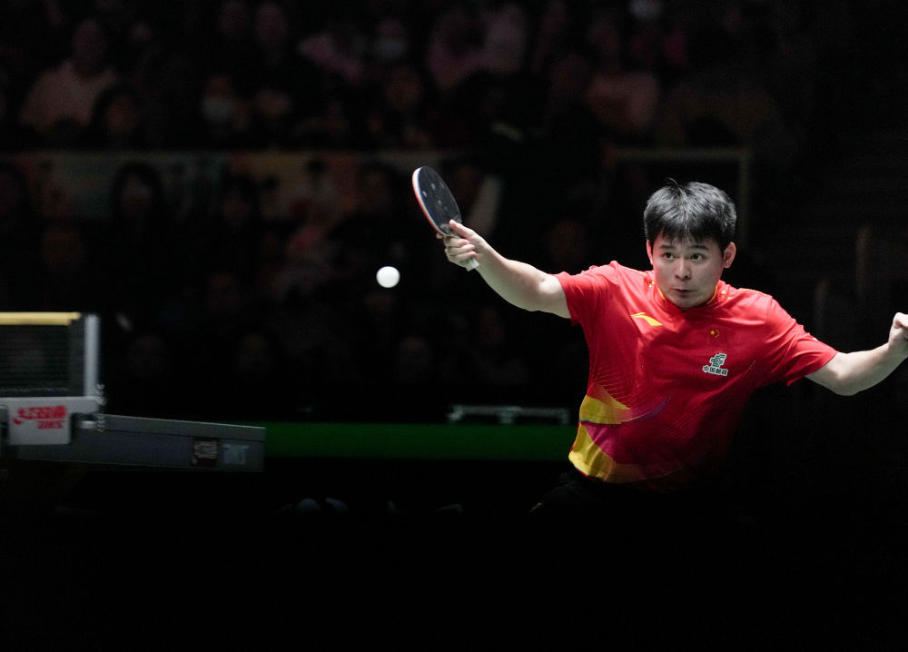 ↑ 中國隊選手林詩棟在男單比賽中回球。他2比1戰勝日本隊選手張本智和。 新华社记者 王迎 摄